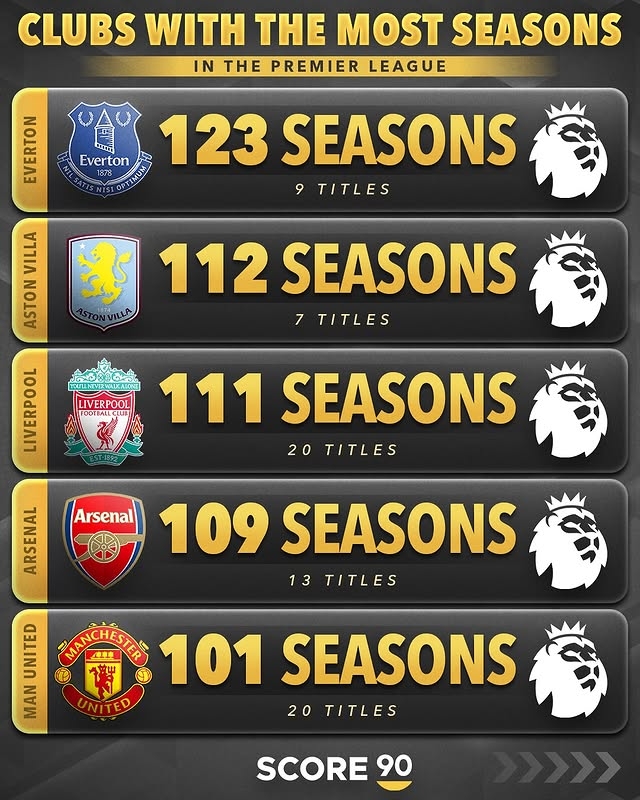 英格兰顶级联赛参赛时长:利物浦111赛季20冠,曼联101赛季20冠
