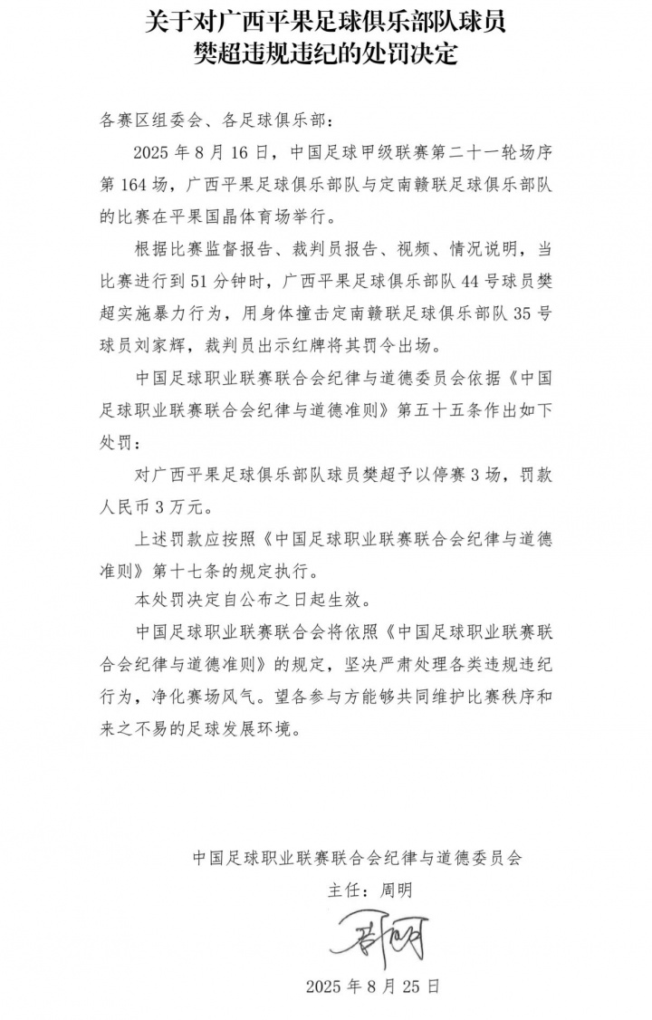 此外,在广西平果与定南赣联的比赛中,定南赣联王念念寒犯规后有踩踏算作被出示红牌,他被责罚停3场罚3万。广西平果球员樊超雷同因暴力行为停3场罚3万。