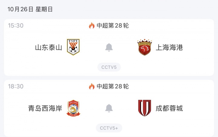 本周日海港将在联赛客场挑战泰山,落伍2分的蓉城将客场挑战西海岸。