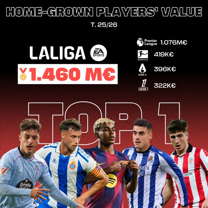 西甲是欧洲青训球员总市集价值最高的联赛,达14.6亿欧元,远超英超(10.7亿欧元)、德甲(9.6亿欧元)、意甲(8.9亿欧元)及法甲(7.6亿欧元)。在2025年夏日转会窗口中,西班牙俱乐部通过原土青训球员转会创下2.89亿欧元的收入记载,创历史新高,印证了其青训政策的奏效。