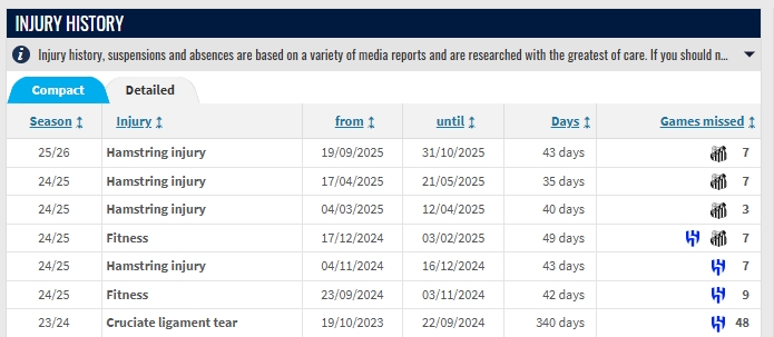 据德转数据统计,内马尔2年来伤缺天数整个592天,缺席88场比赛。