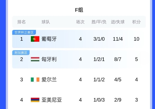 F组花样:C罗率领的葡萄牙惟有投诚爱尔兰便能锁定小组头名,晋级寰宇杯;要是先运转的比赛中,匈牙利未能打败亚好意思尼亚,那么葡萄牙平局就可锁定头名。