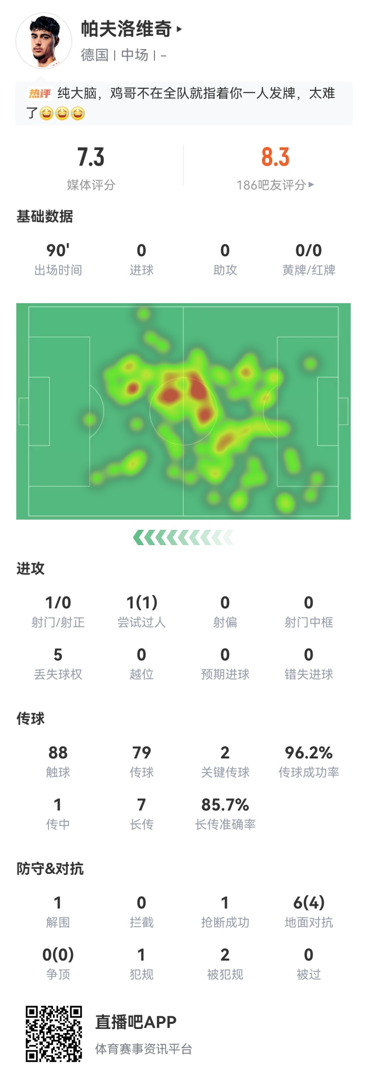 帕夫洛维奇仍是纠合3轮世初赛占据了德国队后腰的首发位置,可以见得主帅纳格尔斯曼对他的信任。本场比赛帕夫洛维奇发扬可以,79次传球得手率96.2%,长传得手率85.7%,6次顽抗4次得手。