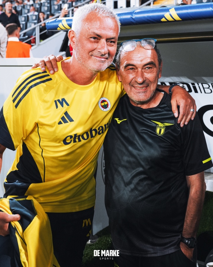 7月31日讯 费内巴切和拉皆奥在本日进行友谊赛,两队主帅穆里尼奥和萨里也旧雨再会。