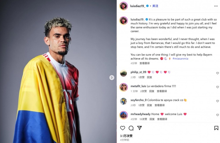 7月31日讯 拜仁照旧官宣从利物浦签下哥伦比亚边锋迪亚斯,后者也通过社媒晒出签约照并发文操心: