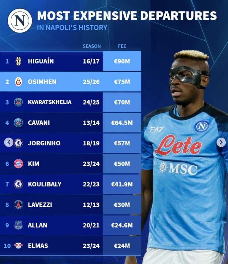 7月31日讯 奥斯梅恩转会加拉塔萨雷只待官宣,《转会阛阓》也统计了那不勒斯队史最贵卖情面况,伊瓜因仍居首。