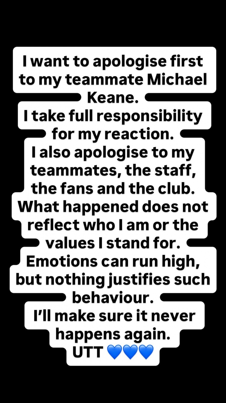 英超第12轮比赛,埃弗顿客场1-0打败曼联。此役埃弗顿球员盖耶与队友基恩发生冲破,他因批颊基恩被裁判出示红牌罚下。盖耶社媒发文,为我方的行径谈歉。