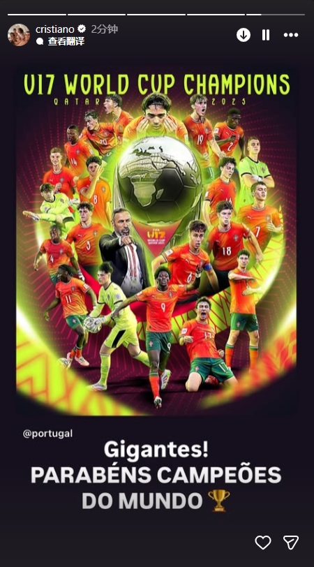 葡萄牙U17宇宙杯夺冠,葡萄牙球星C罗在社媒为U17队奉上了道贺,C罗转发了葡萄牙的夺冠海报,并配文:“巨东说念主!恭喜你们,宇宙冠军🏆”
