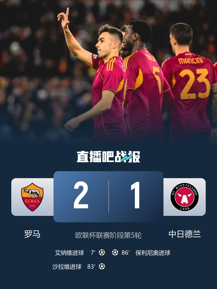 切利克助攻艾纳维破门,科内伤退,沙拉维进球扩大比分优势。全场比赛法子,罗马2-1中日德兰。