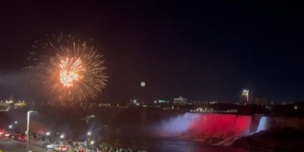 牌面!尼亚加拉瀑布亮灯红、黑、白三色,接待曼联探问好意思国