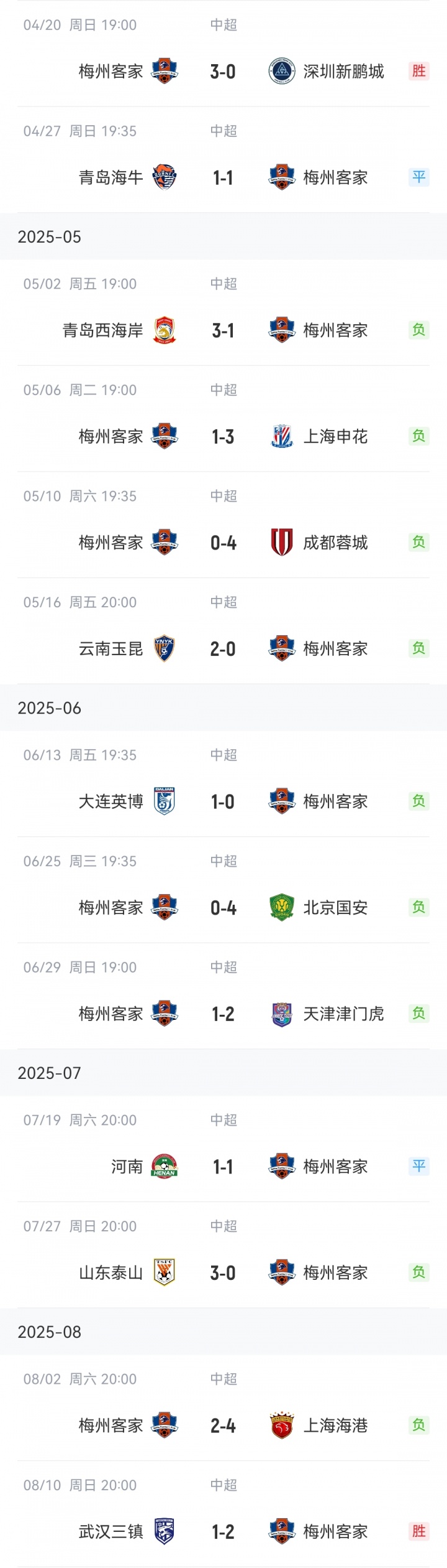 不仅如此,梅州客家本场胜利终结了球队近11轮不胜的尴尬。梅州客家上一次赢球还要追溯到4月20日3-0深圳新鹏城的比赛,此后球队2平9负。