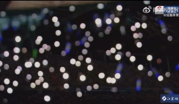 本场比赛进行过中,突发灯光熄灭的情况。现场球迷举起手机闪光灯应援,赛场化身演唱会现场。