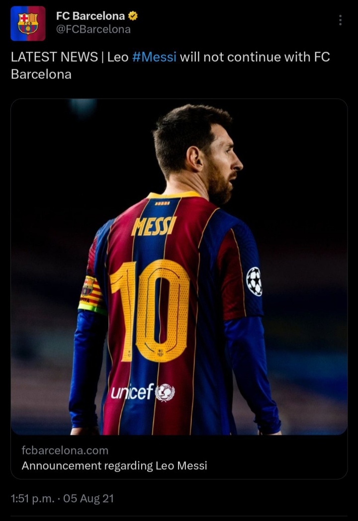 巴萨衷心地感谢梅西为俱乐部的壮大而做出的贡献,祝愿他未来生活和职业生涯一切顺利!