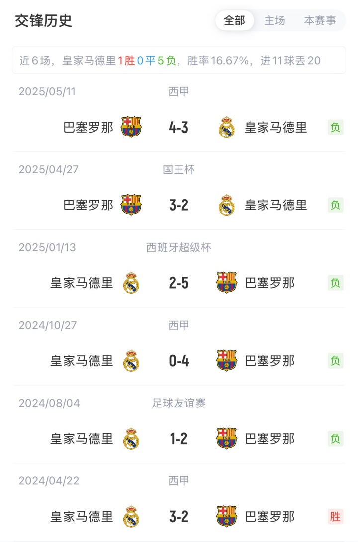 联赛方面,皇马8胜1负领跑,领先巴萨2分。本场皇马若取胜,将把领先优势扩大到5分;巴萨若取胜则将反超皇马登顶。