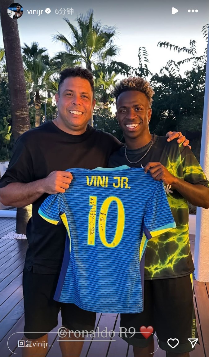 维尼修斯社媒晒同大罗合照,共同手持维尼修斯的巴西10号球衣