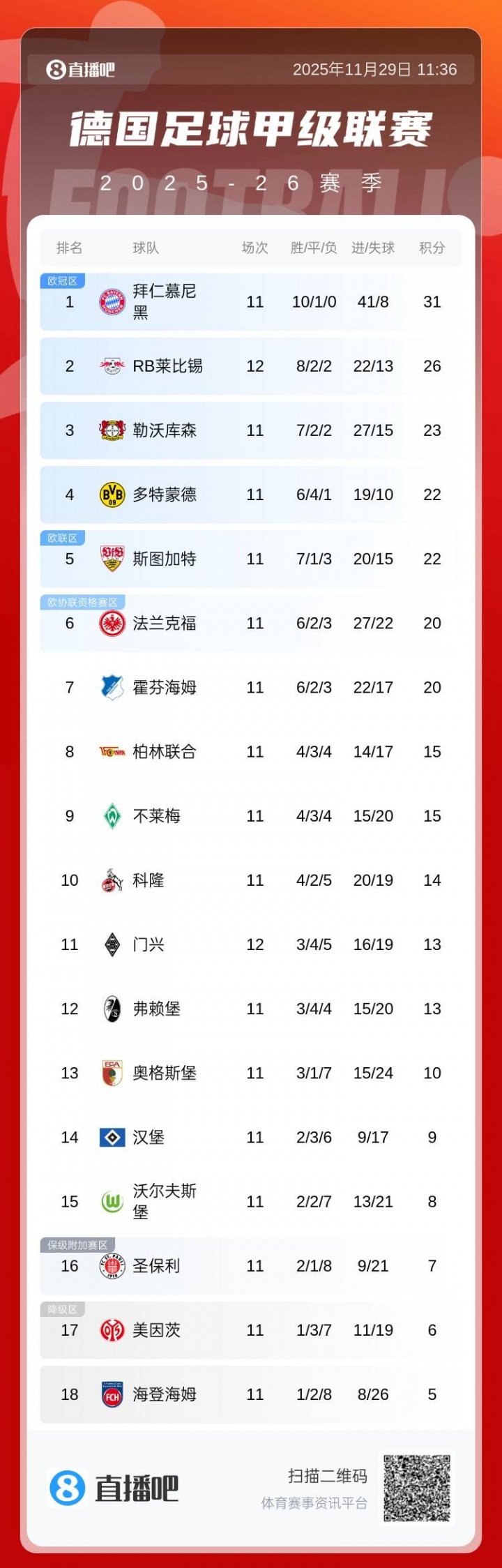 莱比锡战平后仍居德甲第2,拥有3分领先优势,因此德甲第2名本轮之后最多也只有26分。排在榜首的拜仁则将有机会将领跑优势扩大到8分。本轮拜仁将在主场对阵保级队圣保利。