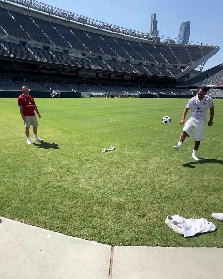费迪南德与鲁尼在美国一起参加活动,两人在球场内颠球互传,最终鲁尼失误。