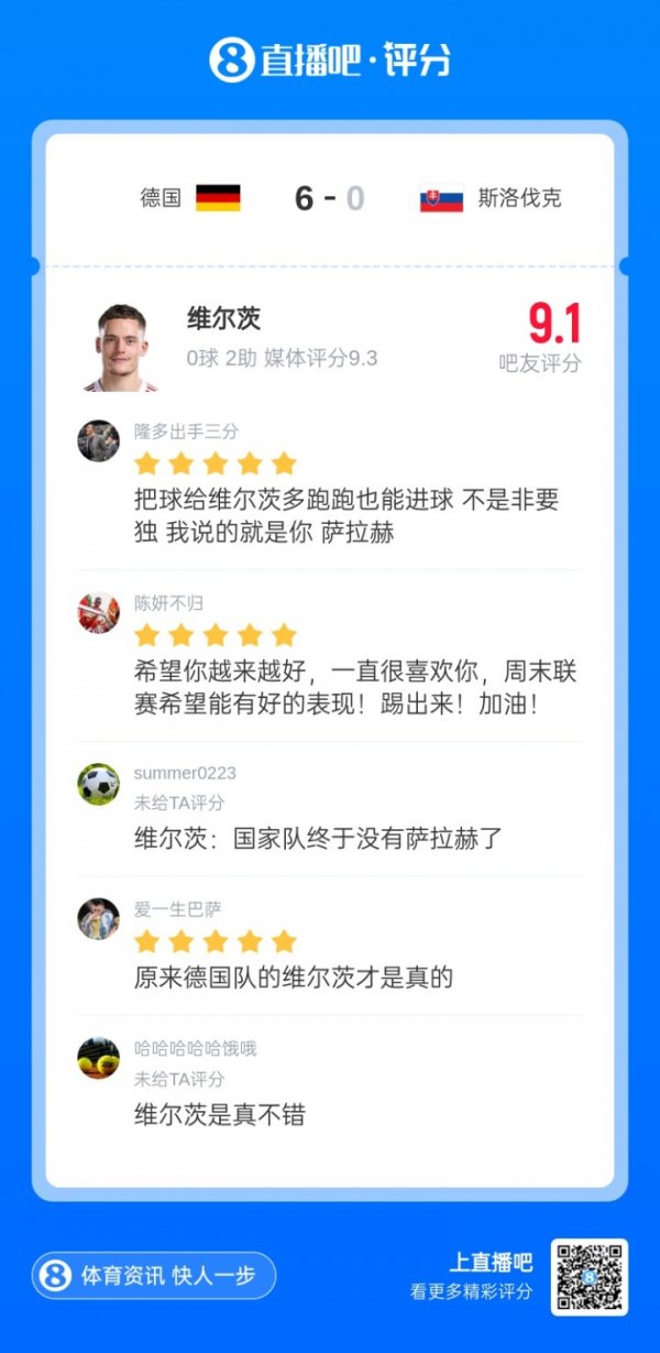 凌晨世预赛欧洲区最后一轮,德国6-0大胜斯洛伐克,顺利取得直通世界杯的名额。本场比赛维尔茨首发出战77分钟,送出两次助攻,优异的表现获得了吧友9.1分的评分。......查看更多