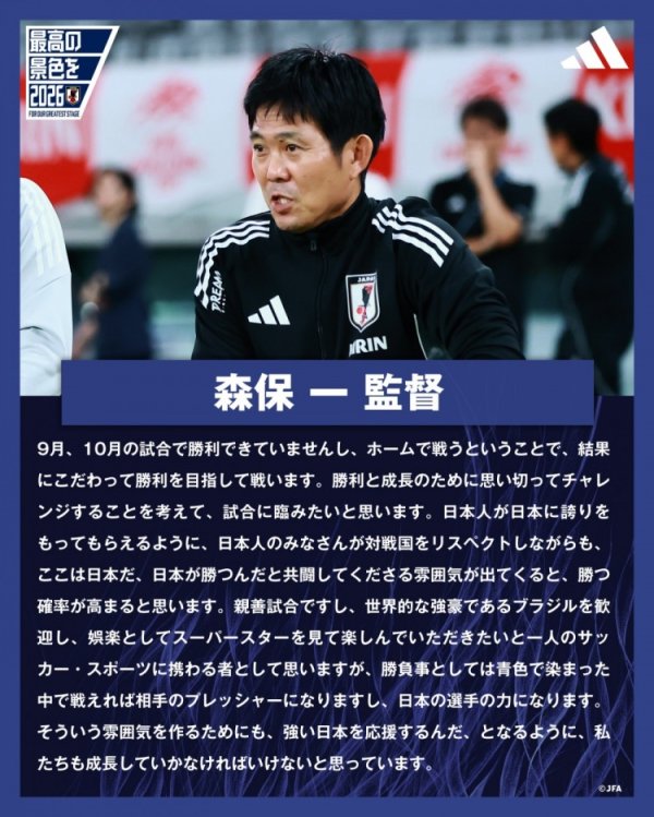 10月14日讯 北京时间今晚18:30,国际友谊赛日本队将在主场迎战巴西队。日本国家队官推更新,晒出昨日训练后主教练森保一接受采访的内容。 森保一表示:“从9月的国际比赛日以来我们还没取得胜利,这次我们在主场作战,毫无疑问比赛目标就是取胜,希望带着取胜的目标和收获成长的心态来迎接与巴西队的比赛。希望日本国民能以日本队为荣耀,对每个交手的国家都充满尊重和敬意,营造球迷和球员团结一心共赴胜利的氛围,这样的话我想是有助于提高球队的胜率的。” “虽然只是一场国际友谊赛,但对手巴西队是......查看更多