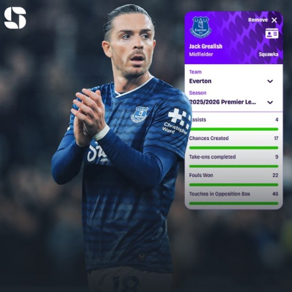 格拉利什本赛季助攻4次、创造机会17次、被犯规22次,皆英超最多