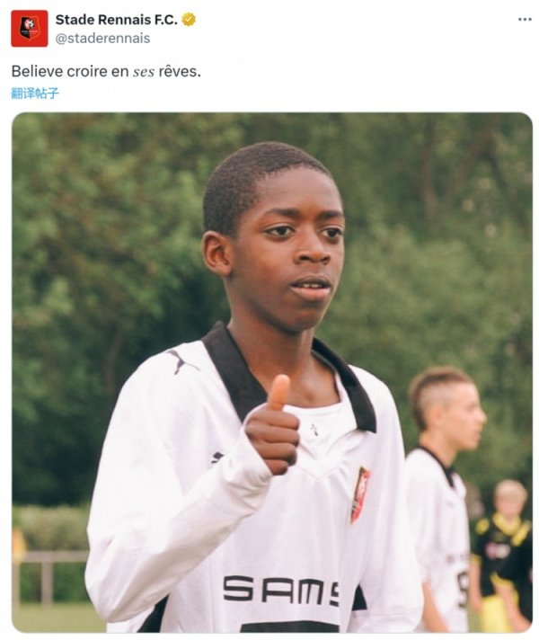 登贝莱母队雷恩社媒晒球员儿时照片:相信自己的梦想