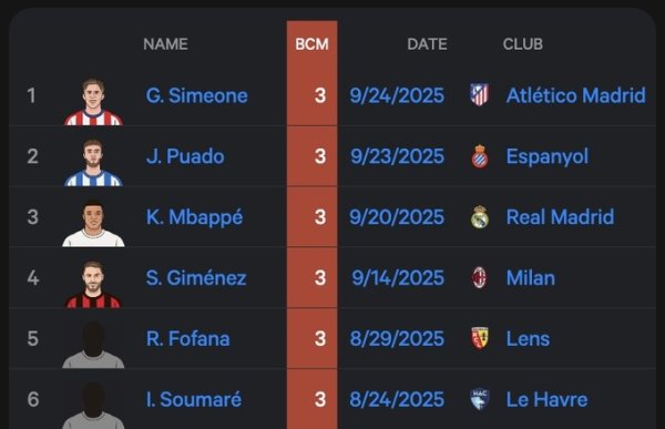 9月25日讯 Stat Muse统计了五大联赛单场错失重大机会最多的球员,有六人单场错失3次重大机会,并列第一。 本赛季五大联赛单场错失重大机会排名: 朱利亚诺-西蒙尼(马竞),3次 普阿多(西班牙人),3次 姆巴佩(皇马),3次 希门尼斯(AC米兰),3次 拉扬-福法纳(朗斯),3次 伊萨-索玛尔(勒阿弗尔),3次......查看更多