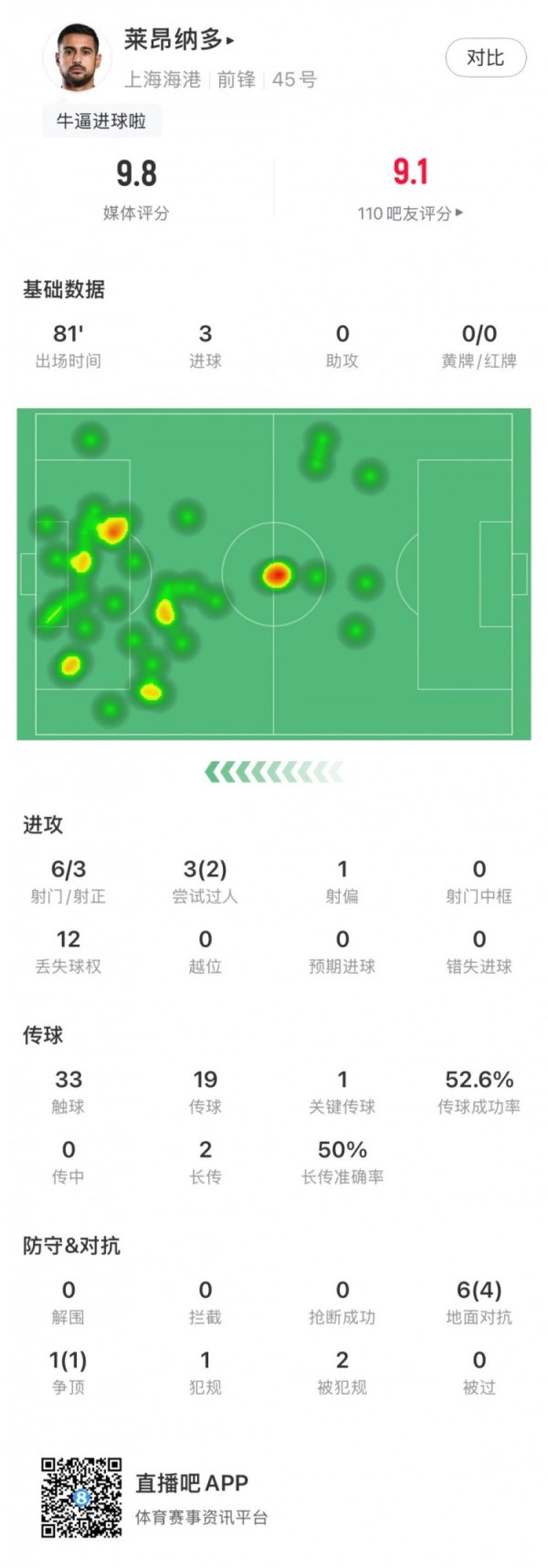 9月21日讯 中超第25轮迎来焦点战,最终凭借莱昂纳多的帽子戏法,上海海港客场3-2力克北京国安,先赛1场暂时登顶联赛。莱昂纳多获评9.8分的全场最高评分。 莱昂纳多本场数据如下: 评分9.8分 出场时间81分钟,打进3球 射门3次,射正3次 尝试过人3次,成功2次 丢失球权12次 触球33次,传球19次,传球成功率52.6% 关键传球1次 长传2次,成功率50% 地面对抗6次,成功4次 争顶1次,成功1次 犯规1次,被犯规2次......查看更多