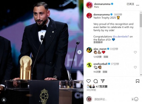 9月23日讯 多纳鲁马更新社媒动态,庆祝赢得雅辛奖,并祝贺斩获金球的前队友登贝莱。 多纳鲁马社媒晒出领奖的照片,并写道:2025年雅辛奖🏆非常自豪能获得这份认可,能与家人一起庆祝感觉更棒了!” “恭喜登贝莱获得金球奖。”......查看更多