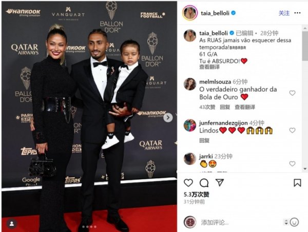 9月23日讯 拉菲尼亚妻子娜塔莉亚更新社媒动态,晒出与拉菲尼亚出席金球奖颁奖典礼的照片。 拉菲尼亚在金球奖评选中排名第5位,娜塔莉亚社媒晒出一家人出席颁奖典礼的照片,并配文:“大家永远不会忘记这个赛季!参与61粒进球,你太不可思议了!”......查看更多