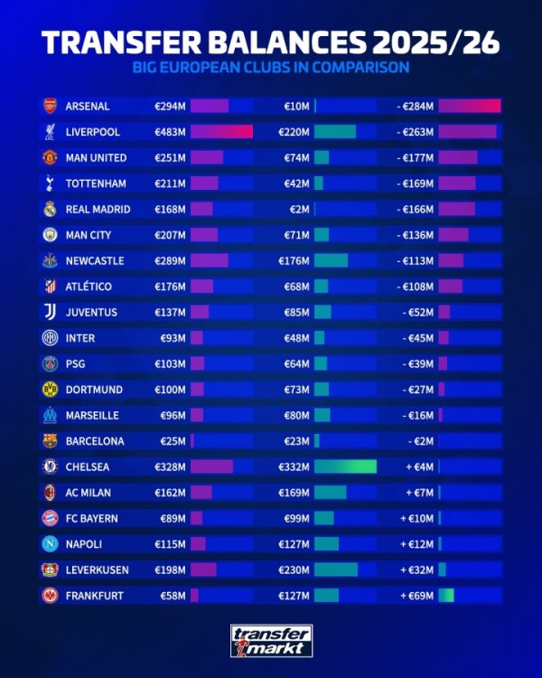 09月05日讯 德转统计了大俱乐部的夏窗净投入排行,枪手2.84亿居首,红军第2,曼联第3。 此外,巴萨、切尔西、米兰等队实现了盈利,法兰克福盈利了6900万欧。 2025大俱乐部夏窗净投入排行(欧) 1.阿森纳 2.84亿 2.利物浦 2.63亿 3.曼联 1.77亿 4.热刺 1.69亿 5.皇马 1.66亿 6.曼城 1.36亿 7.纽卡 1.13亿 8.马竞 1.08亿 9.尤文 5200万 10.国米 4500万 11.巴黎 3900万 12.多特 2700万 13......查看更多