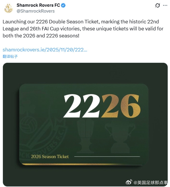 在赢得第 22 个联赛冠军和第 26 个爱尔兰足协杯冠军后,沙姆洛克推出2026和2226双赛季套票,一张季票在两个赛季都能用。 官方给的使用说明:“购买 2026 年赛季票,赛季结束后,把它锁在安全的地方,让你的曾曾曾曾孙在 2226 年使用!” ......查看更多