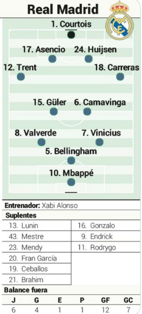 11月23日讯 北京时间明天凌晨4点,皇马将在西甲第13轮比赛中客场对阵埃尔切。《阿斯报》预测了皇马此役的首发阵容。 阿斯报预测皇马对阵埃尔切首发 门将:库尔图瓦 后卫:阿诺德、阿森西奥、赫伊森、卡雷拉斯 中场/边锋:居莱尔、卡马文加、巴尔韦德、维尼修斯、贝林厄姆 前锋:姆巴佩......查看更多