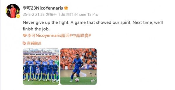 8月2日讯 中超联赛第19轮,上海申花客场在0-3落后的情况下,4-4战平云南玉昆。赛后,申花球员李可更新了个人社交媒体。 李可在个人微博中写道:永远不要放弃战斗。一场展现了我们精神的比赛。下次,我们会完成这项工作。......查看更多