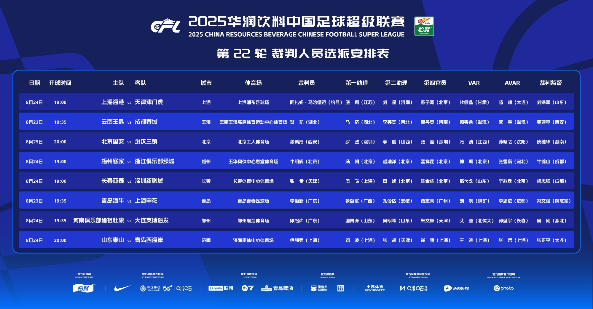 08月23日讯 中超第22轮裁判出炉,约旦裁判国法海港vs津门虎,VAR杜健鑫。