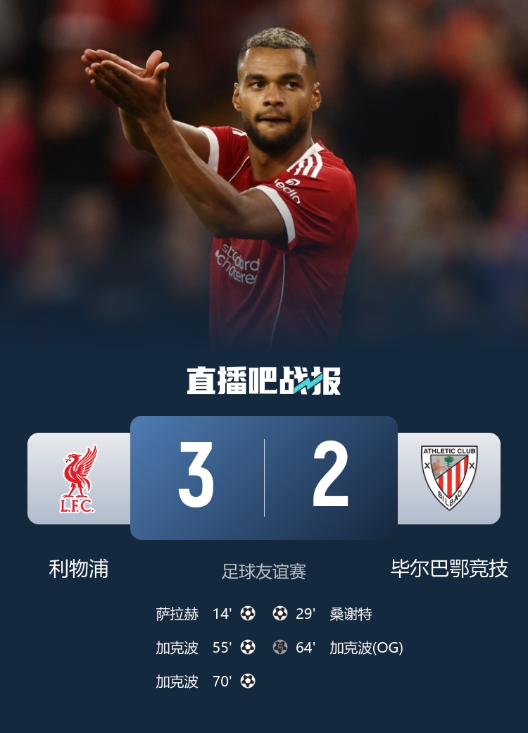 友谊赛第二场,利物浦3-2打败毕巴,赤军在此次通顺2场的友谊赛兑现双杀。