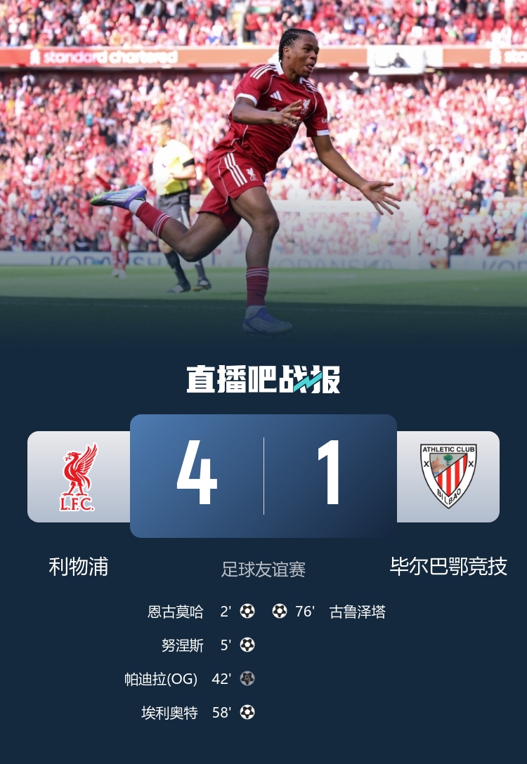 利物浦与毕巴进行通顺热身赛,首场对决,利物浦4-1取胜,恩古莫哈、努涅斯与埃利奥特获取进球。