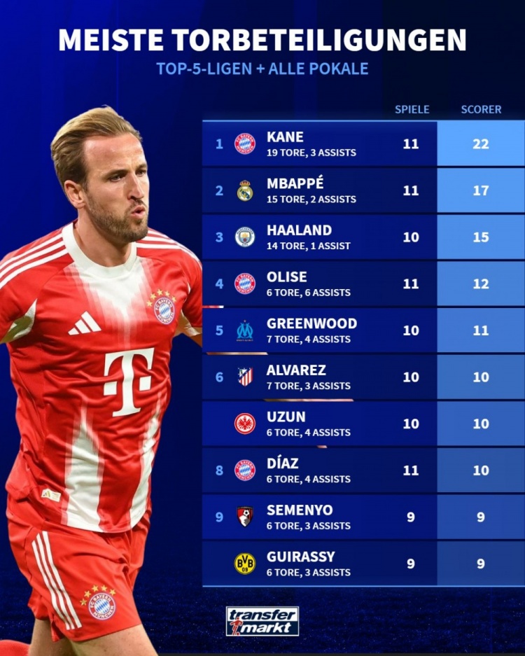 10月20日讯 《转会市集》统计了本赛季五大联赛球员在俱乐部各项赛事的凯旋参与进球总额情况,凯恩、姆巴佩、哈兰德分列前三。