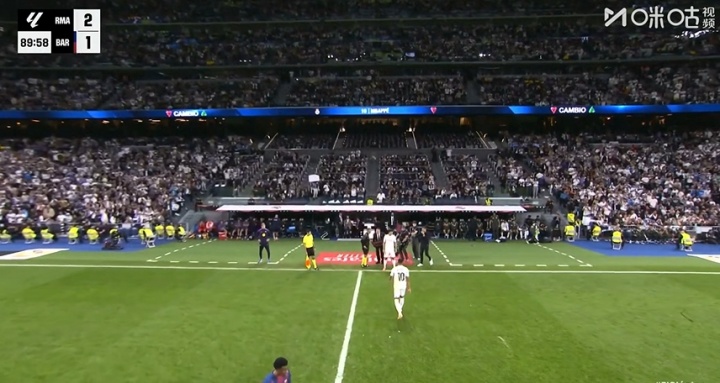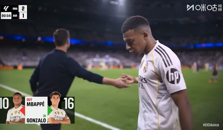 10月27日讯 皇马vs巴萨第90分钟,姆巴佩被贡萨洛换下,全场饱读掌。姆巴佩下场后与贡萨洛以及阿隆索击掌致敬。