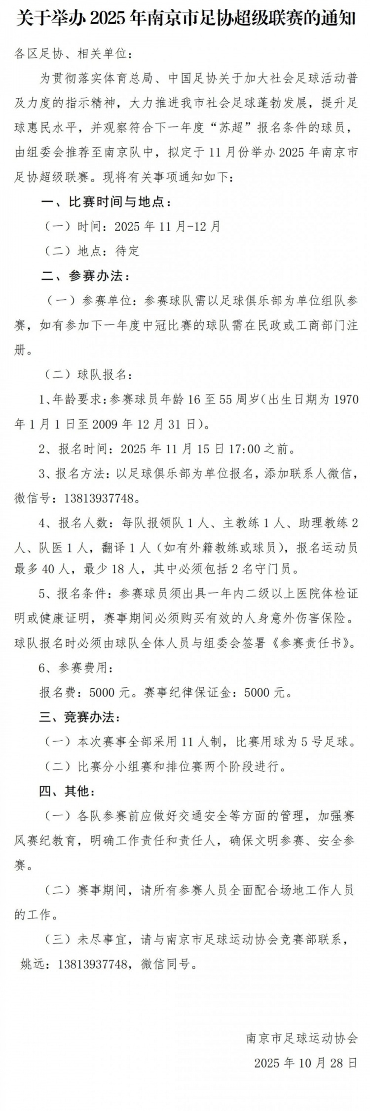 10月28日讯 本日,南京足协发布音尘,拟定于2025年11月举办南京市足协超等联赛,旨在鼓动城市社会足球蕃昌发展,并不雅察合适下一年度“苏超”报名条目的球员。