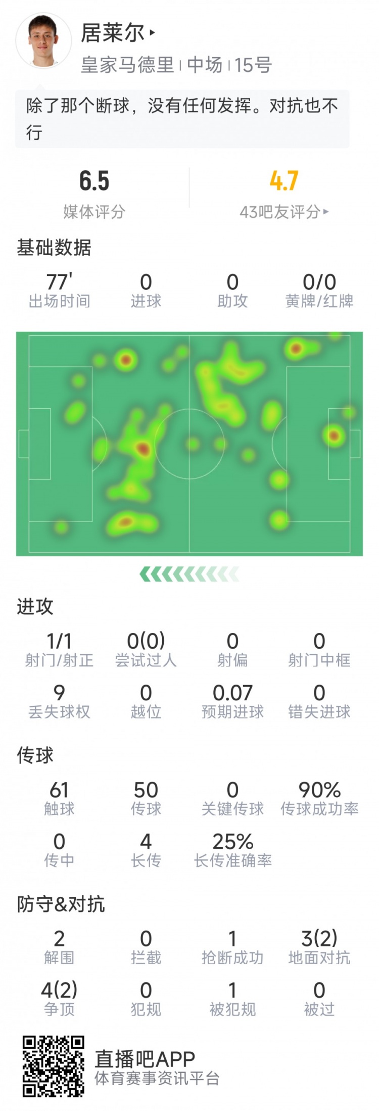11月5日讯 在本轮欧冠皇马对利物浦的比赛中,居莱尔被替换下场以下为他在本场数据: