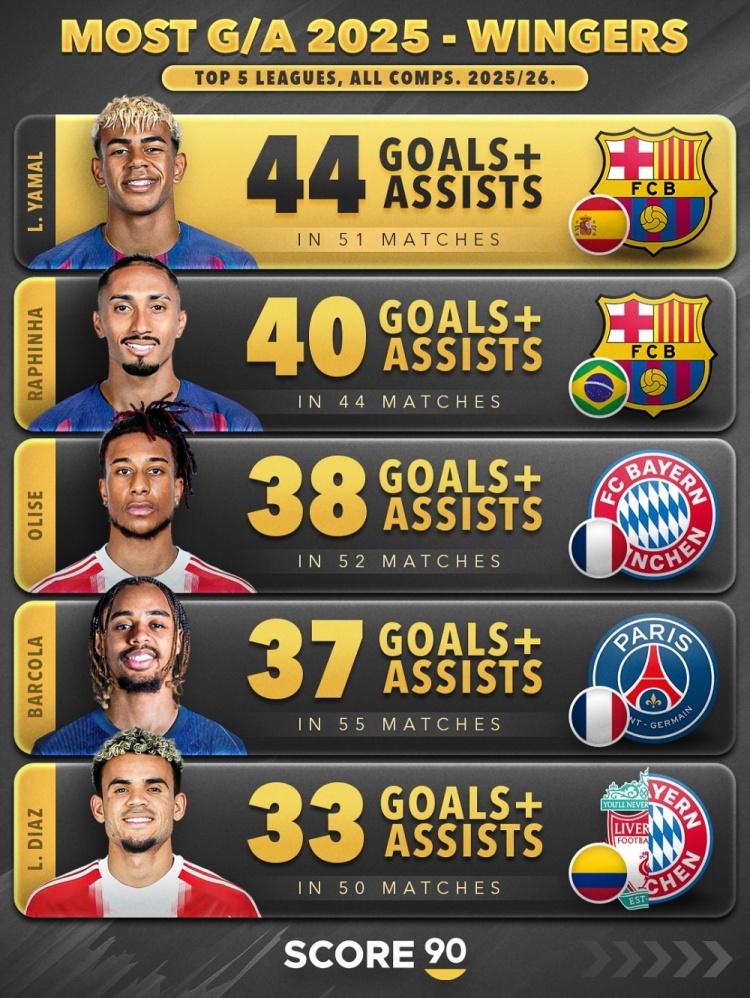 2025年边锋参与进球榜:亚马尔44球居首,拉菲尼亚40球次席