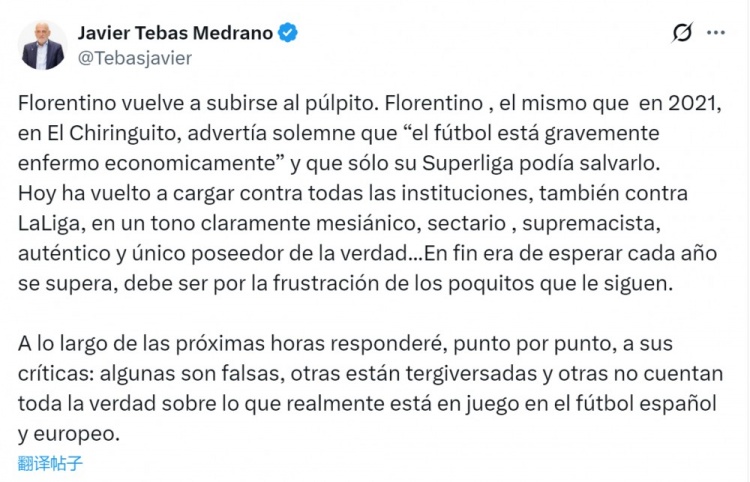 特巴斯社媒写说念:“弗洛伦蒂诺又开动阔步高谈了,恰是这位弗洛伦蒂诺,曾于2021年在西班牙六台节目中翔实告诫说‘足球正濒临严重的经济危急’,并声称唯独他的超等联赛才气转圜足球。