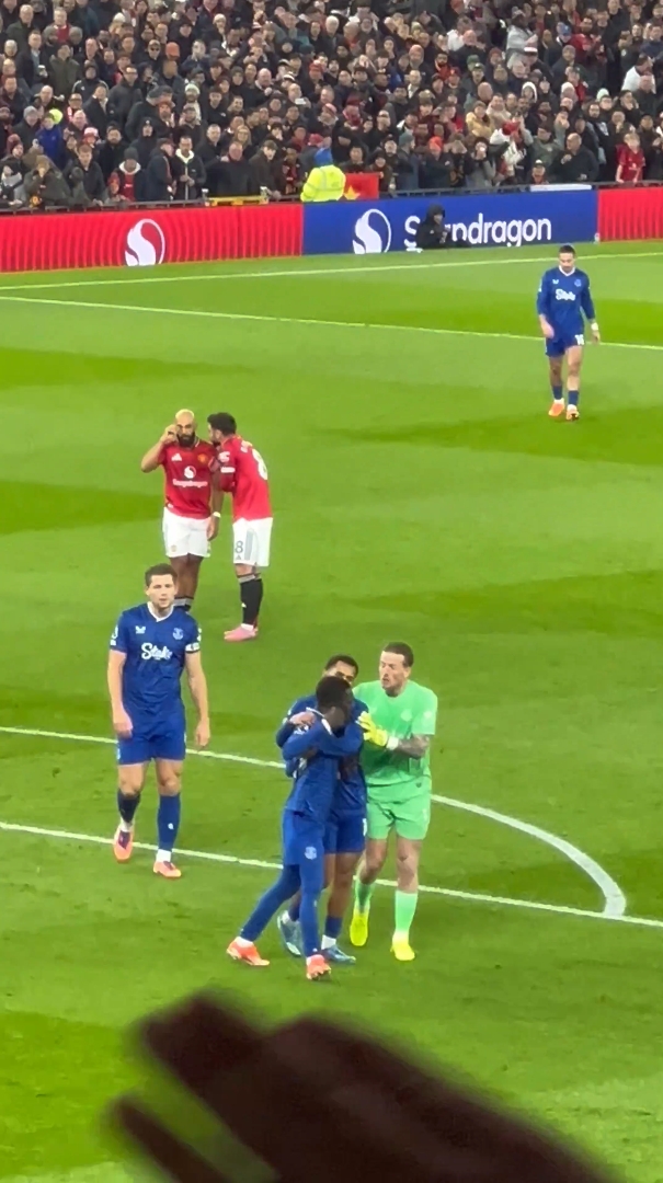 盖耶染红后神气欢乐喋喋抑制,皮克福德和恩迪亚耶抱住安抚,盖耶仍在挥拳似乎要打东谈主。