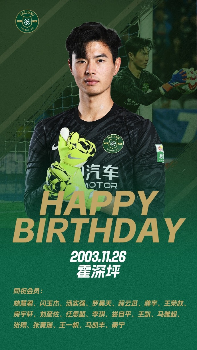 11月26日讯 中超浙江队官方发文,为门将霍深坪庆祝22岁诞辰。