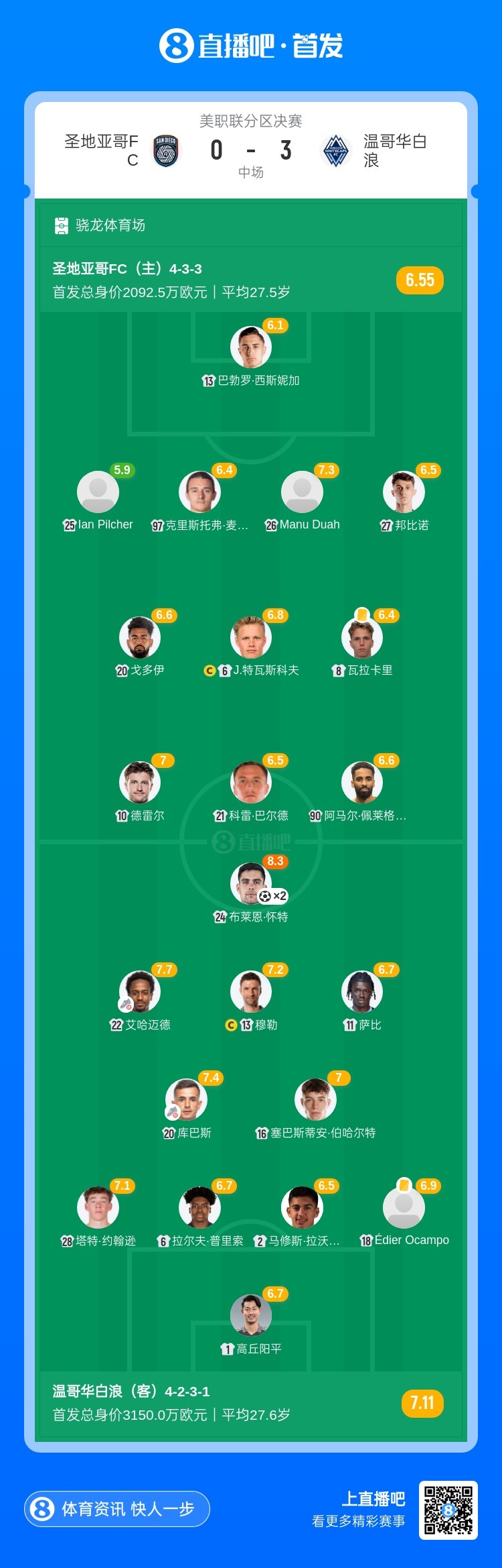 11月30日讯 北京工夫11月30日上昼10:00,好意思职联分区决赛,圣地亚哥FC镇守骁龙畅通场对阵温哥华白浪。上半场,怀特推佛门,巴勃罗乌龙球,怀特双响。半场战罢,圣地亚哥FC暂0-3温哥华白浪。
