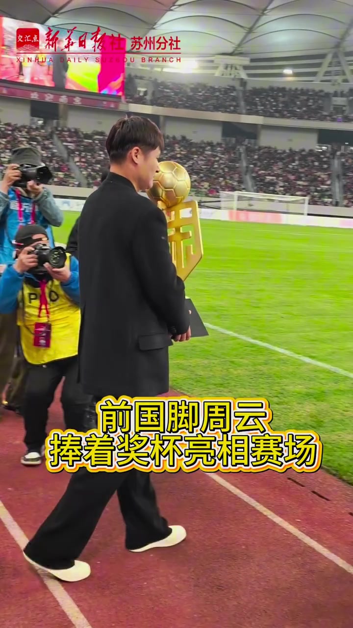 新华日报社苏州分社官方发布现场视频,在比赛开动前,前江苏球员周云捧着奖杯亮相双城赛现场。