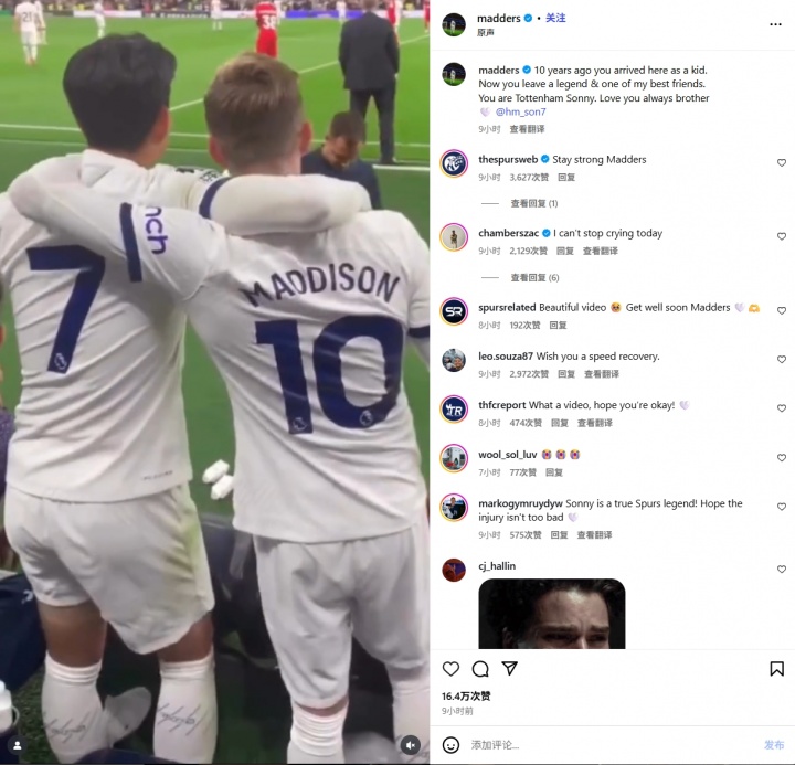 泪目!疑似重伤后麦迪逊仍发文请安孙兴慜:热刺听说&我的一又友
