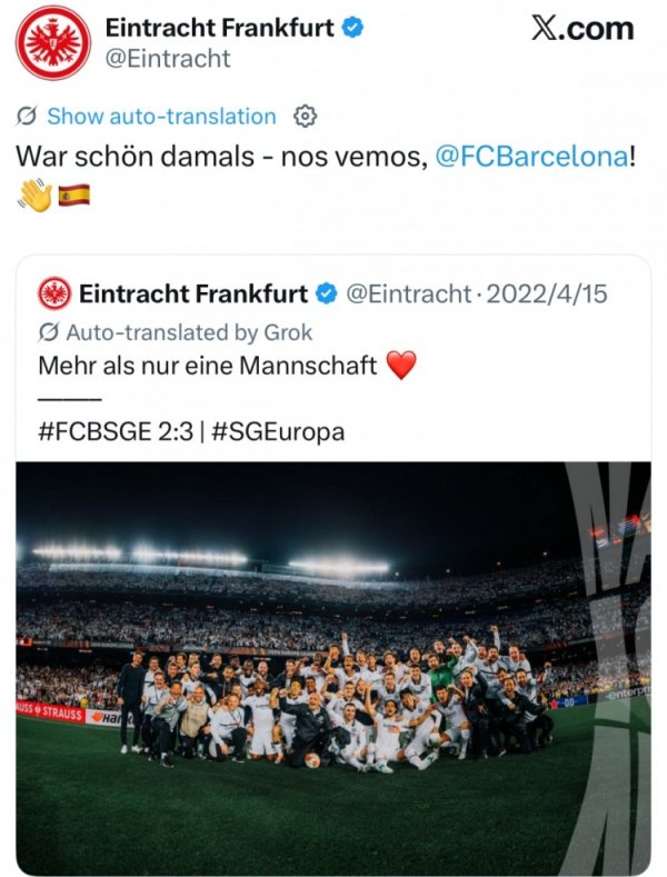 8月29日讯 25/26赛季欧冠联赛抽签效果出炉,联赛阶段法兰克福将在客场对战巴萨。 在抽签出炉后,法兰克福官推转发了22年4月,球队在欧联杯1/4决赛次回合客场3-2打败巴萨晋级下一轮的赛后球队合影庆祝得手的社媒,并配文写说念:“那是一段神秘的履历,期待咱们的再次相见,巴萨!” 2021/22赛季欧联杯1/4决赛,首回正当兰克福主场1-1战平巴萨,不外次回合在巴萨主场他们3-2取胜,从而以4-3的总比分插独揽一阶段,而且最终夺得该赛季的欧联杯冠军。值得一提的是,那场比赛由于......查看更多