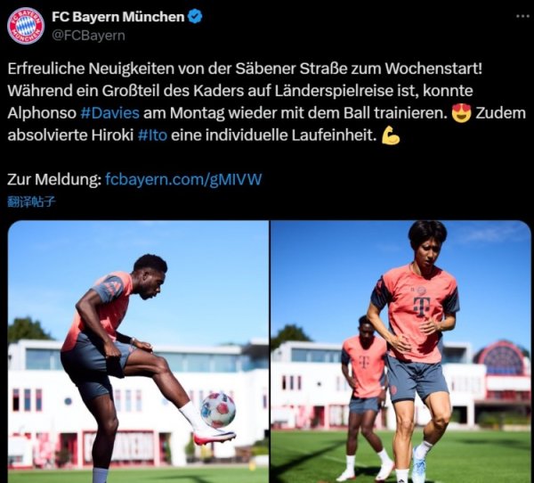 好音讯!拜仁官方:戴维斯收复有球教练,伊藤洋辉收复跑步教练