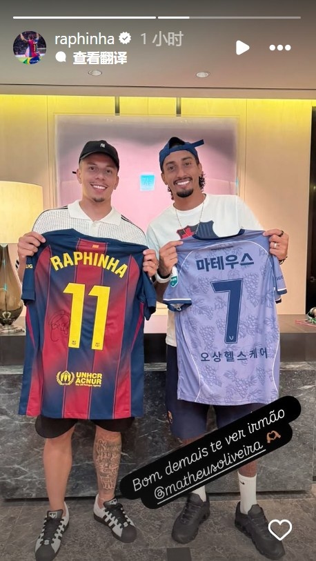 拉菲尼亚与K联赛外助交换球衣,晒照并配文:很酣畅见到你 昆季